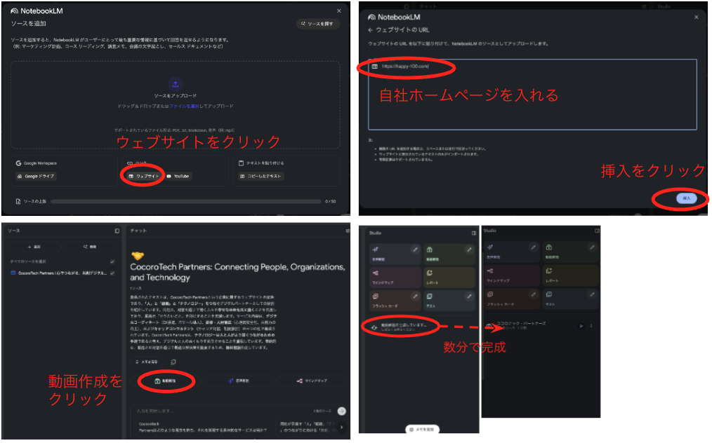 1、自社サイトのURLをNotebookLMに入力