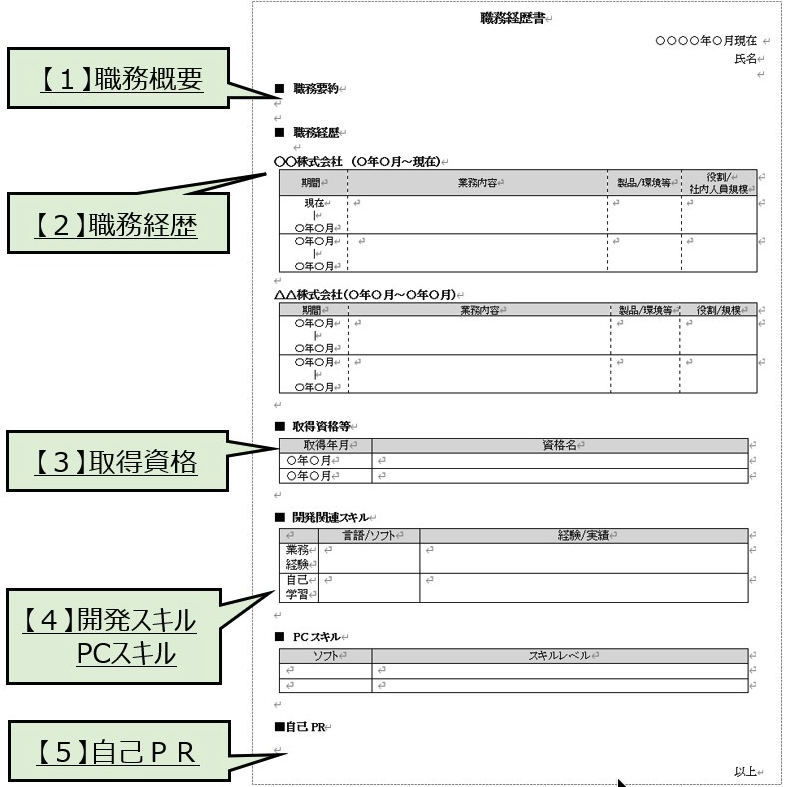 最初の1行目にプロジェクトの要約説明をしたり、項目ごとに改行したりして、パッと見て、読みやすい経歴書にしましょう。